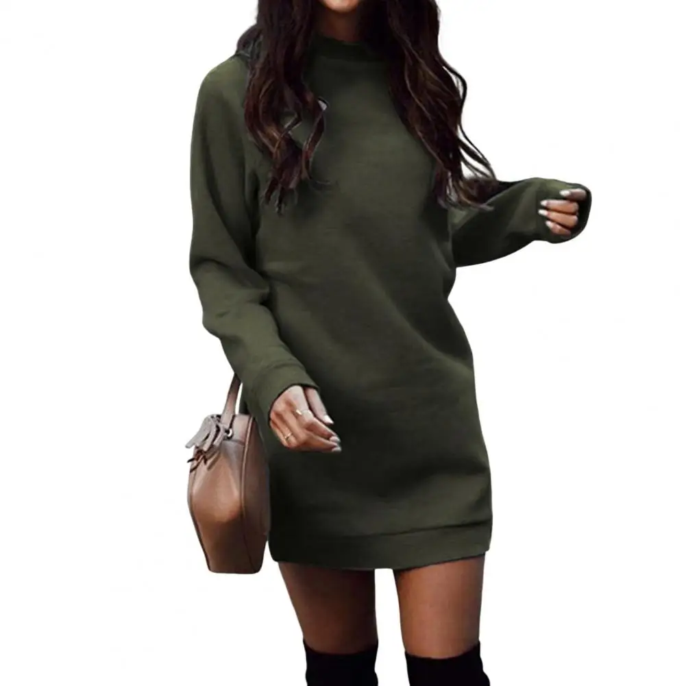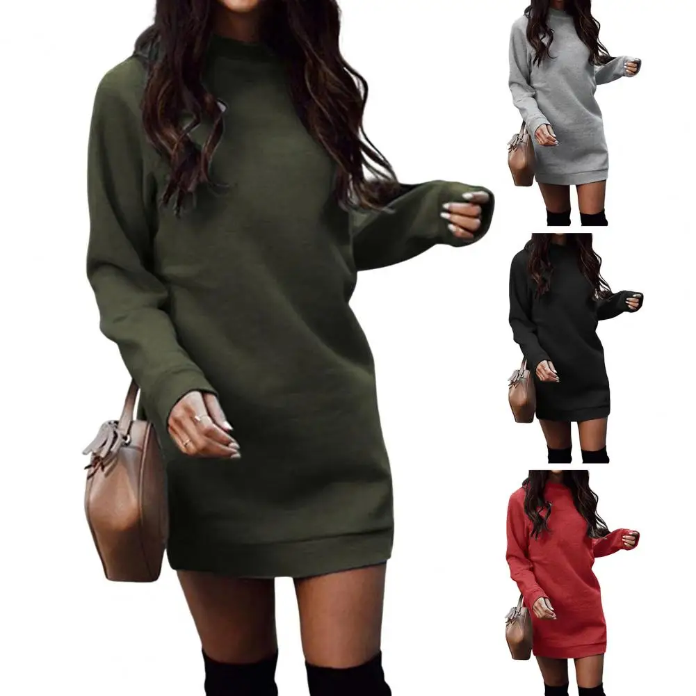 Fall Winter Dress Thickened Plush Solid Color Loose Round Neck Stretchy Hem Cuff Pullover Above Knee Length Daily Wear Mini Dress